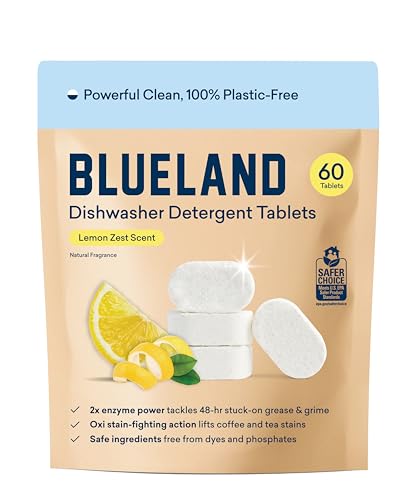 BLUELAND 100% Plastic-Free Dishwasher Detergent Tablets, 60 Count, Lemon Zest Scent, Eco Friendly Dishwashing Pods, Natural, USDA Certified biobased