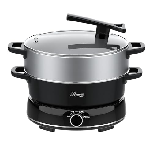 X in 1 MULTI-FUNCTIONAL: Sauté pan, slow cooker, steamer, food warmer, baby food maker, hot pot, sterilizer and more.MULTI-POWER ADJUSTMENT ELETRIC HOT POT: The Rosewill electric hot pot offers versatile cooking options. It has a triple power setting: Low, Med and High heat. The adjustable power control goes up from 400W to 1200W to 1600W, allowing you to use the different power settings for cooking different ingredients and recipe.PERFECT FOR WEEKLY MEALS PREP: 35% larger searing surface than other leading 8Qt multicookers. It cooks large meals for groups rapidly, with no long waits – perfect for families serving up to 12 people.LARGER CAPACITY BUT TAKE LESS SPACE: 12.7QT large capacity electric hot with 2 tier separate hot pot(6.3QT) and steamer(6.4QT), it can steam varied foods simultaneously while hot pot. But the stackable steam basket can save space, easy to store on countertop, best for your kitchen.EXTRA STAINLESS STEEL STEAMER: The steam basket allow you to steam a wide range of foods while cooking. ideal for steaming vegetables, meat and fish, which provides one of the healthiest ways to cook for dinner, minimize the loss of nutrients and vitamins. Especially good for baby food.OVEN SAFE TO 430°F: Removable cooking pot is oven safe up to 430°F, so you can sauté the ingredients first and then finish your meal in the oven for a crispy top. All in one pot.HEALTHY PFSA-FREE NON-STICK COATING: The cooking pot features a 100% food-grade high-quality non-stick coating that's PFAS-free. This feature also prevents food from burning during heating, allowing you to fully enjoy the stir fry function.