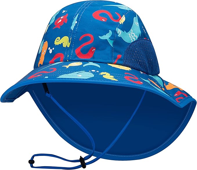 Sun protection - UPF 50+ Certified sun Rating, block 98% of UVA and UVB rays. Large brim and neck flap protects your children’s head, eyes, and neck from the sun rays.Adjustable size - The head strap and chin strap adjusts as your child grows.Breathable - Two side ventilation holes offers added breathability to help keep your kids’ head cool.Foldable Packable: Packable and portable for easy storage and travel.Size - Hat circumference: Size M 18” -20” (48-52cm) suggested to 2-6 YRS;Size L 20”-22” (52-56cm) suggested to 6-13 YRS.Hand wash cold, Do not Bleach, Line Dry, Do not Iron, Do not Dry Clean.100% Polyester
