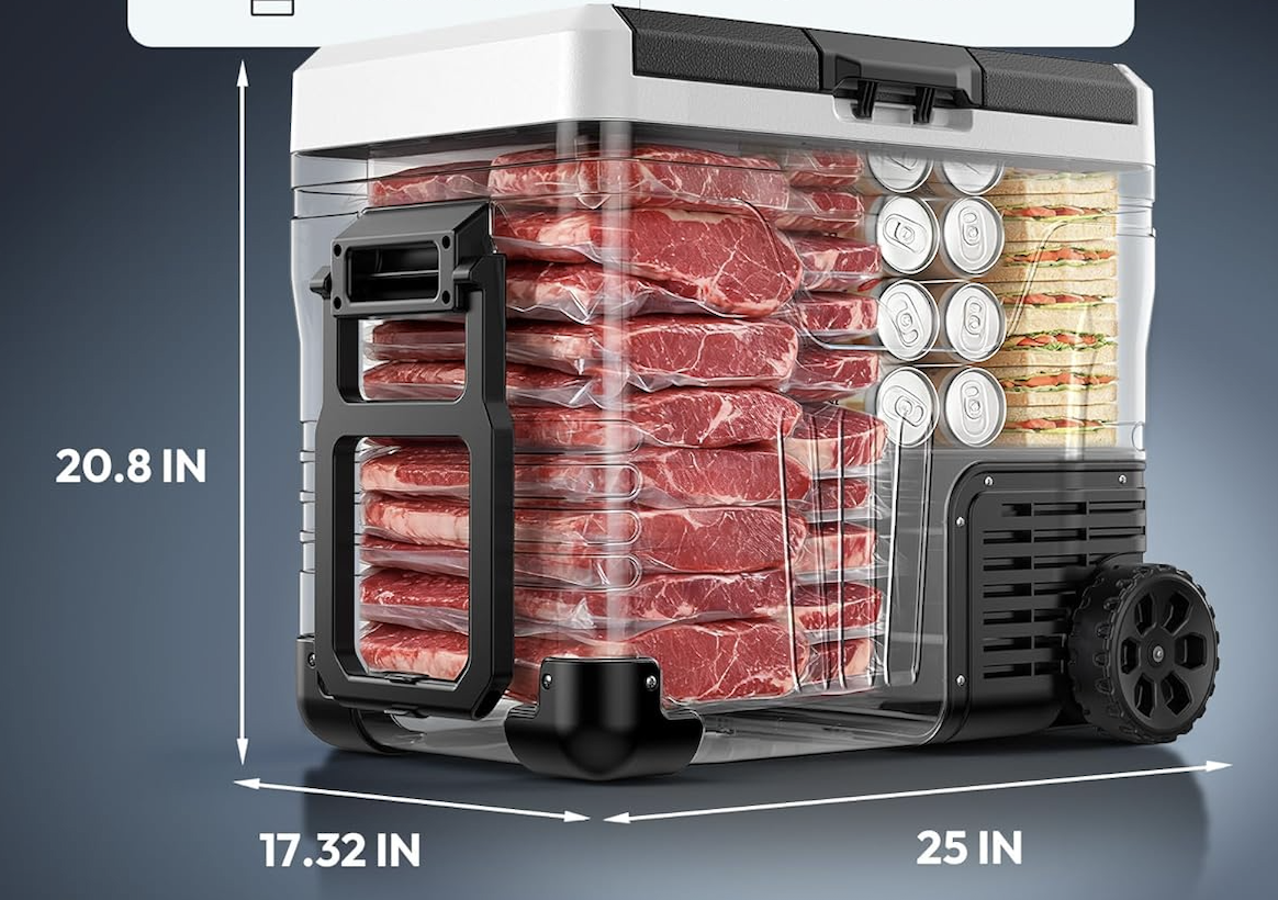 【双区分隔设计,移动便捷】采用双区设计,有效减少异味。53夸脱的大容量、两个储物篮和一个可拆卸隔板,让您轻松存放和取用所有食物。配备双把手和越野轮,方便携带和移动,减轻您的旅途负担。 【强劲压缩机与卓越保温性能】配备高效变频压缩机,制冷能力强劲,温度范围为-4°F至68°F。该便携式冰箱通过UL能源认证,具有节能ECO模式和快速制冷MAX模式。车载冰箱外壳采用复合保温耐磨材料制成,确保您在旅途中拥有卓越的保温性能和保护性能。 【人性化设计,静音运行】简洁的液晶控制面板,方便调节温度。内部铝膜材质提升了保温性能。运行噪音仅为40分贝,静音效果极佳,并采用防震设计,即使在高达30度的崎岖坡道上也能平稳运行。 【电池保护与多种电源模式】这款便携式电冰箱提供三级电池保护,可让您在低/中/高三种模式之间调节输入功率,以防止过载或车辆电池耗尽。便携式冰箱可使用直流电或交流电供电,适用于各种场景。