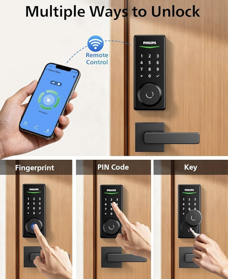 五种解锁方式:多种方式让您轻松进入家中——通过应用程序、指纹、PIN 码、语音助手或实体钥匙。 PIN码功能支持永久密码、一次性密码、定时密码和循环密码,非常适合家庭成员、客人、租客、保姆等使用。