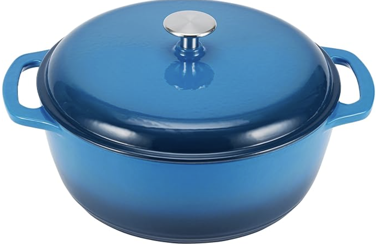 此款荷兰煮锅6夸脱容量,大小非常适中。在铸铁基材的内外均经过搪瓷工艺处理,搪瓷是涂烧在金属底坯表面上的无机玻璃瓷釉,兼备了金属的强度和瓷釉华丽的外表以及耐化学侵蚀的性能,不但安全无毒,易于洗涤洁净,还可以防止金属生锈和抗腐蚀,因为不是涂层,所以不用担心会涂层脱落后食用影响健康。