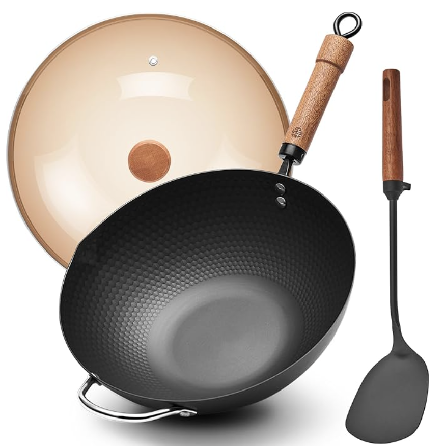 [加厚碳钢,稳固耐用]——与那些容易变形的轻薄锅具不同,这款炒锅采用加厚碳钢锻造而成,重量约为3.6磅(约1.6公斤)。这种“重型”结构设计确保了平坦的锅底在电磁炉或玻璃灶台上始终保持平整,绝不变形。它提供了一种坚实、稳固的烹饪体验,相比追求轻便,它更注重经久耐用。 [辅助手柄,安全掌控]——真正的品质,往往分量十足。考虑到这款炒锅的扎实分量,我们在主木柄的对面特别设计了一个坚固的“辅助手柄”。这种符合人体工学的设计让您可以轻松地用双手端起、倾倒或转移分量十足的家庭大餐;相比单柄炒锅,它提供了更卓越的安全性和平衡感。 [无惧金属锅铲,附赠铁铲]——告别那些一刮就花的脆弱涂层吧!我们的强化碳钢表面专为抵御金属锅铲的磨损而设计——正因如此,我们在包装内特别附赠了一把高品质的“铁铲”!您可以随心所欲地刮炒翻动,毫无后顾之忧。注:本款炒锅未添加任何化学涂层,因此只需进行简单的润油养护,即可自然形成不粘效果。