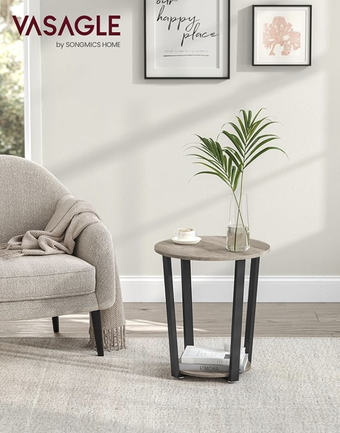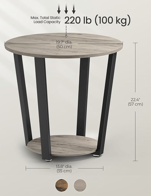 圆润造型:方桌固然不错,但这把边桌独特的圆形设计,定能为您的家居环境注入一股清新的气息。其精心打造的工业风格,更流露出一丝经典韵味。 优雅点缀:凭借其黑色金属支架与“石南灰”色调的桌面,这款边桌能完美衬托您家中的古董摆件,亦或是那一束绚丽夺目的鲜花。无论置于客厅还是其他空间,它都将成为一道亮丽的风景线。 坚固耐用,兼具收纳:它不仅仅是一把引人注目的边桌。得益于厚实的刨花板材质与坚固的钢制支架,这款边桌的总承重能力高达 220 磅(约 100 公斤)。双层置物空间的设计,使其成为您家中不可或缺的实用家具。