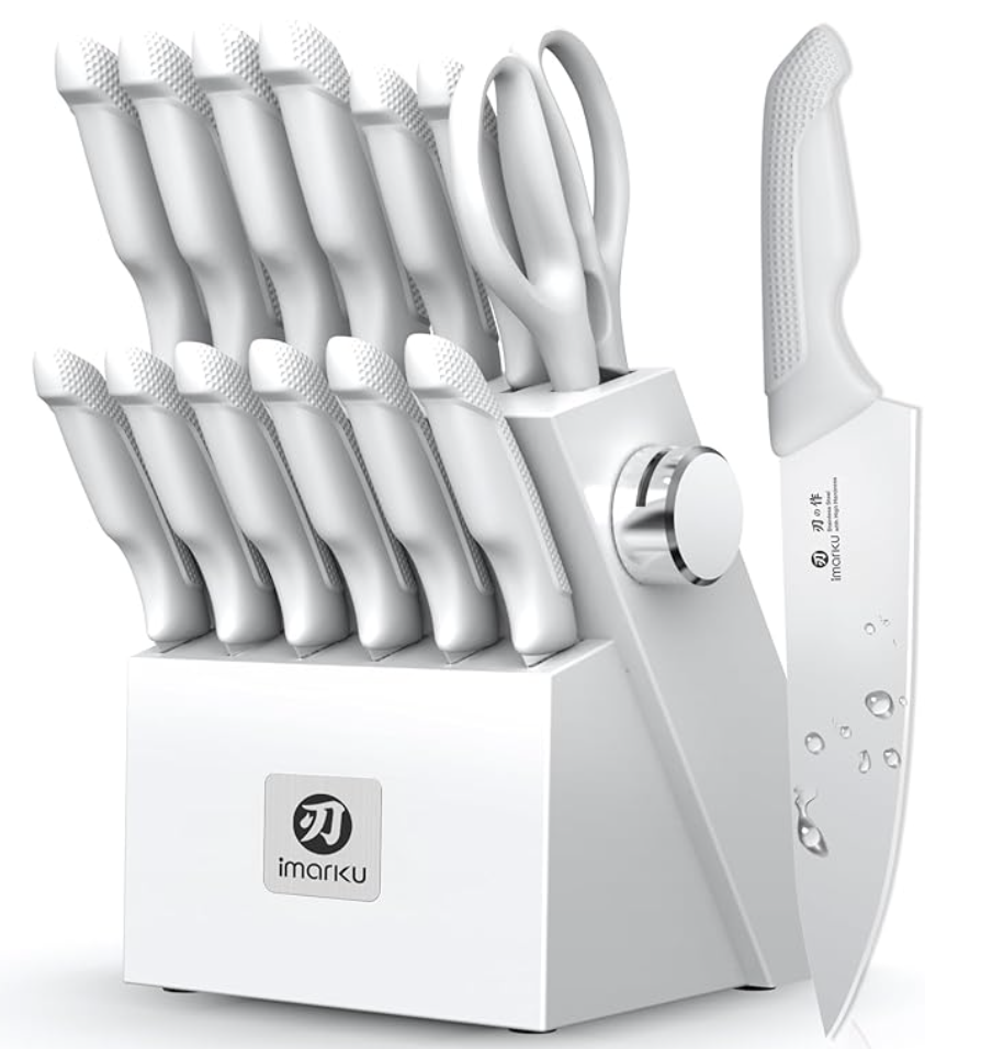 【全套14件式刀座套装】这套“一站式”刀具组合将彻底提升您的厨房烹饪体验:内含8英寸主厨刀、8英寸切片刀、7英寸三德刀、8英寸面包刀、5英寸多用刀、3.5英寸削皮刀、6把4.5英寸锯齿牛排刀、厨房剪刀,以及一个内置磨刀器的坚固实木刀座。它涵盖了您进行切片、切块、切末等各类备菜工作所需的一切工具,是新居入伙家庭的理想之选。