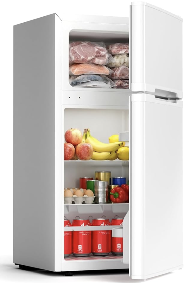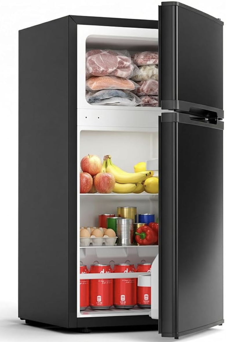 【双门迷你冰箱(带冷冻室)】这款容积为 2.5 立方英尺的紧凑型冰箱,包含一个 1.81 立方英尺的冷藏室和一个 0.64 立方英尺的冷冻室。冷藏室可容纳 12 罐苏打水、6 杯酸奶和 3 个备餐盒;冷冻室则可存放 4 块牛排。无论是作为宿舍冰箱、办公室冰箱还是卧室冰箱,它都能高效满足小空间内的日常食物储存需求。
