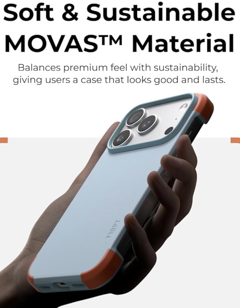 纤薄不失坚固:厚度仅为 2.3mm、重量仅 28g,这款专为 iPhone 17 Pro 设计的边框保护壳采用开放式边缘设计,带来宛若“裸边”般的真实触感;在极致纤薄的形态下,兼顾了日常使用的舒适度与精致周全的防护性能。 至简,亦是杰作:完美平衡的比例与三种材质的和谐交融,共同构筑出独具一格的撞色设计美学。MOVAS 皮革赋予保护壳精致细腻的触感与素皮质感;PC 材质的边框确保结构稳固;而 TPU 材质的四角则提供精准到位的日常防护——一切皆为呈现 iPhone 17 Pro 极简主义的纯粹之美而精心打造。