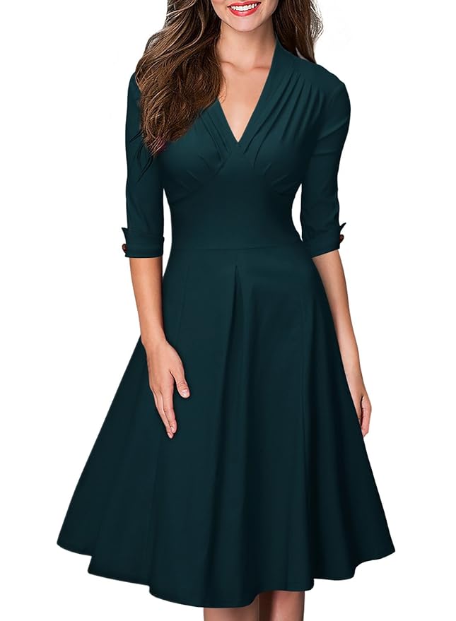 Miusol Women's Retro Deep-V Neck Half Sleeve Vintage Casual Swing Dress
