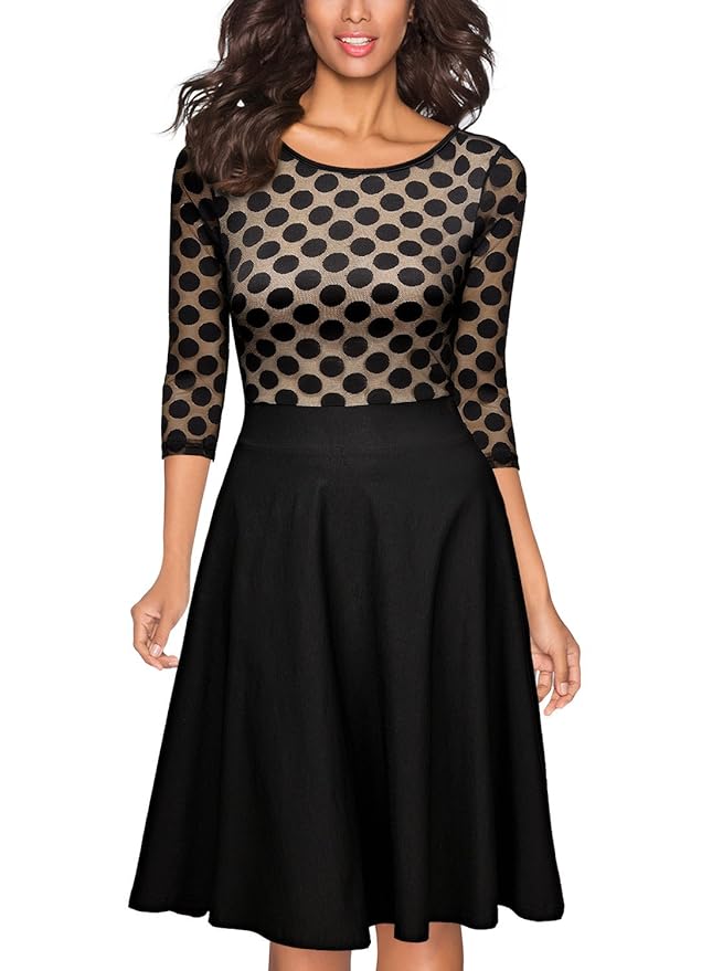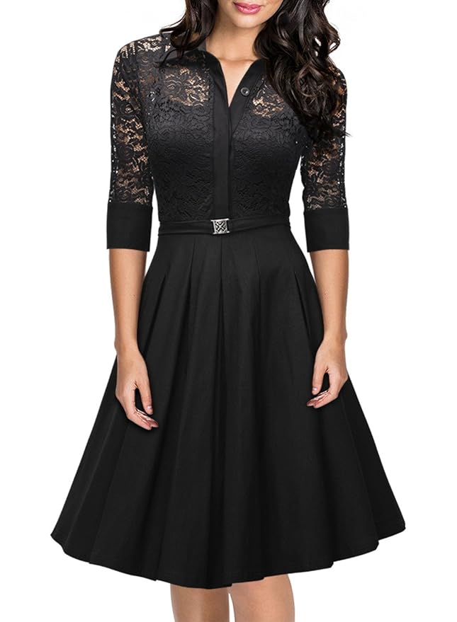 Missmay Women's Vintage 1950s Style 3/4 Sleeve Black Lace Flare A-line Dress