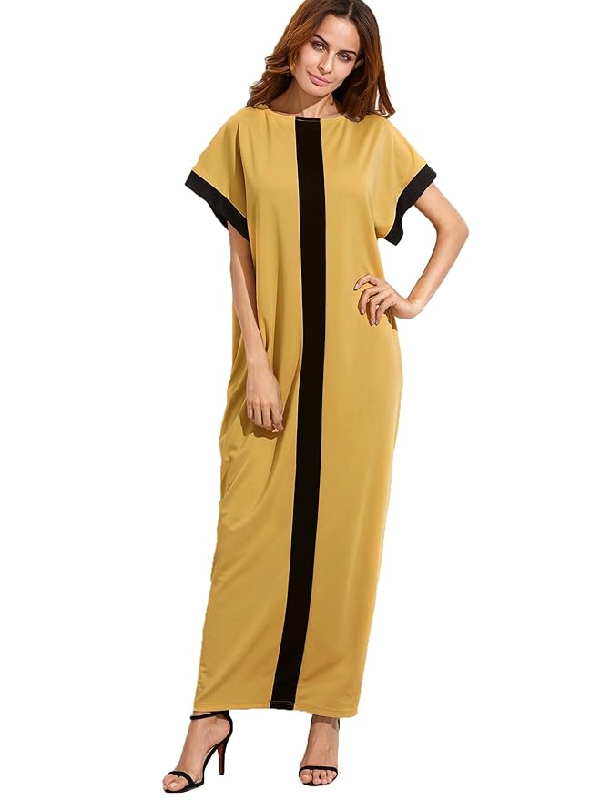 Short Sleeve Color Block Pocket Shift Long Maxi Dress