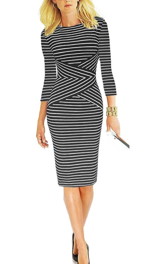REPHYLLIS Women 3/4 Sleeve Striped Wear to Work Business Cocktail Pencil Dress