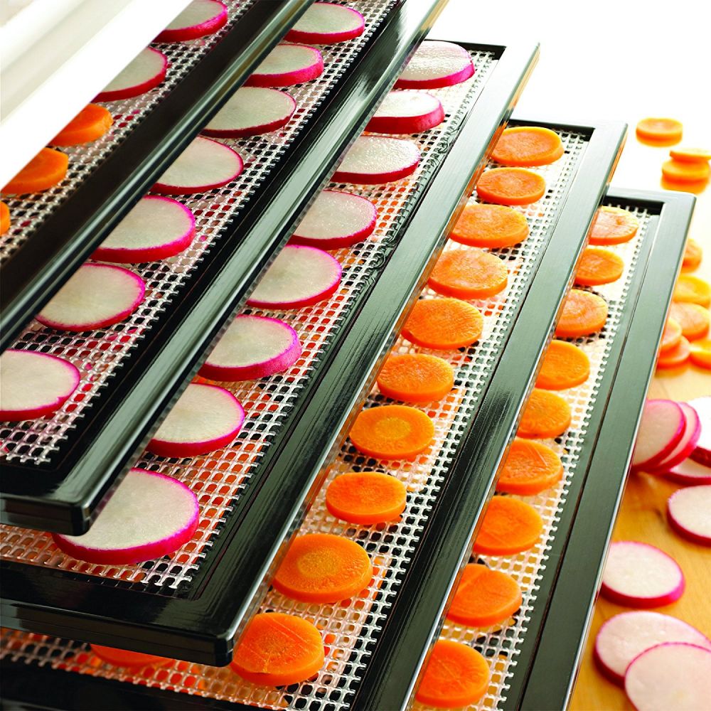 The 3926TB by Excalibur comes with 9 trays, a total of 15 square feet of drying space, 26 hour timer and an adjustable thermostat temperature control that ranges from 105°F to 165°F preserving the nutrients in herbs and produce and making it safe to dehydrate meat for jerky. The fan, heating element and thermostat are in the back of the unit, so cool air is drawn in, heated and then distributed evenly over each tray. The patented Parallex Horizontal Airflow is exclusive to Excalibur and helps the food dehydrate faster, retain more nutrients and look and taste better, without tray rotation. Trays can be removed to raise bread, make yogurts, and use with arts & crafts. Made in USA, Sacramento, California.