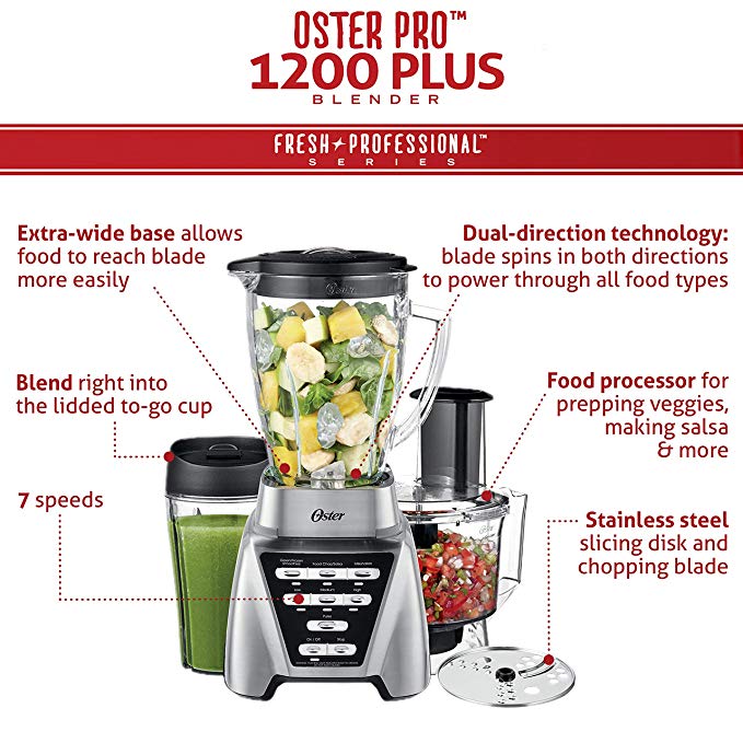 This Oster Pro 1200 Blender Plus Food Processor has a powerful motor that consistently crushes ice, pulverizes greens, and turns frozen fruit into sorbet. Seven speeds including 3 Smart Settings eliminate guesswork and offer one-touch controls for salsas, shakes, and smoothies. And the Dual Direction Blade ups blending power and speed.