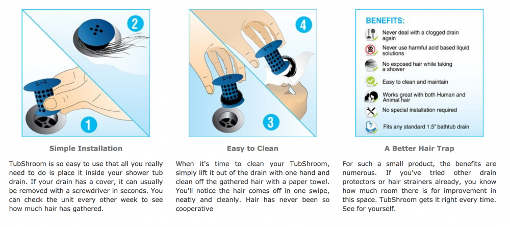 We face a myriad of challenges each and every day. Cleaning clogged drains, thankfully, no longer has to be one of them--thanks to the TubShroom. TubShroom is a bathtub hair stopper fits snug inside your shower tub drain, effortlessly gathering each and every hair that tries to make its way down your vulnerable drain. It's the hero you deserve in your bathroom. You can rest easy knowing that TubShroom works great for all kinds of hair-- human and pet alike. No more exorbitant bills from the plumber and no more having to use harmful chemical-based drain cleaners that damage your pipes.