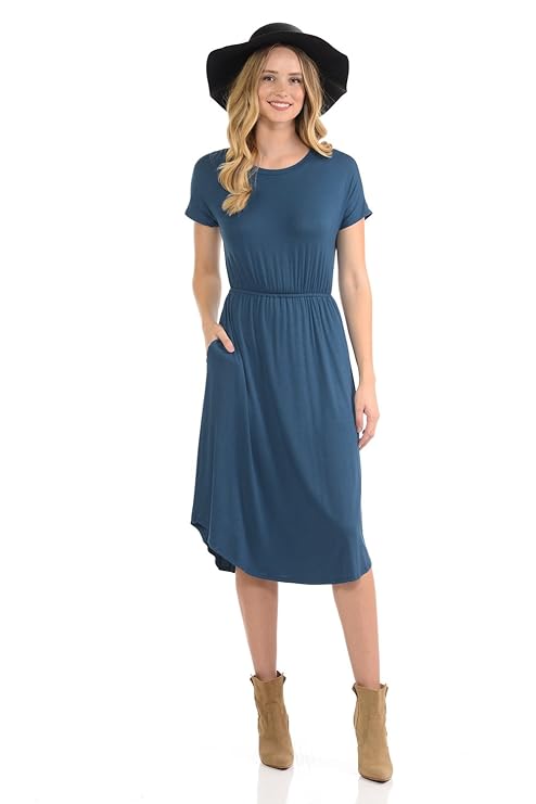$17.99 $21.99 Women's Short Sleeve Flare Midi Dress with Pockets in Solid and Floral - Made in USA