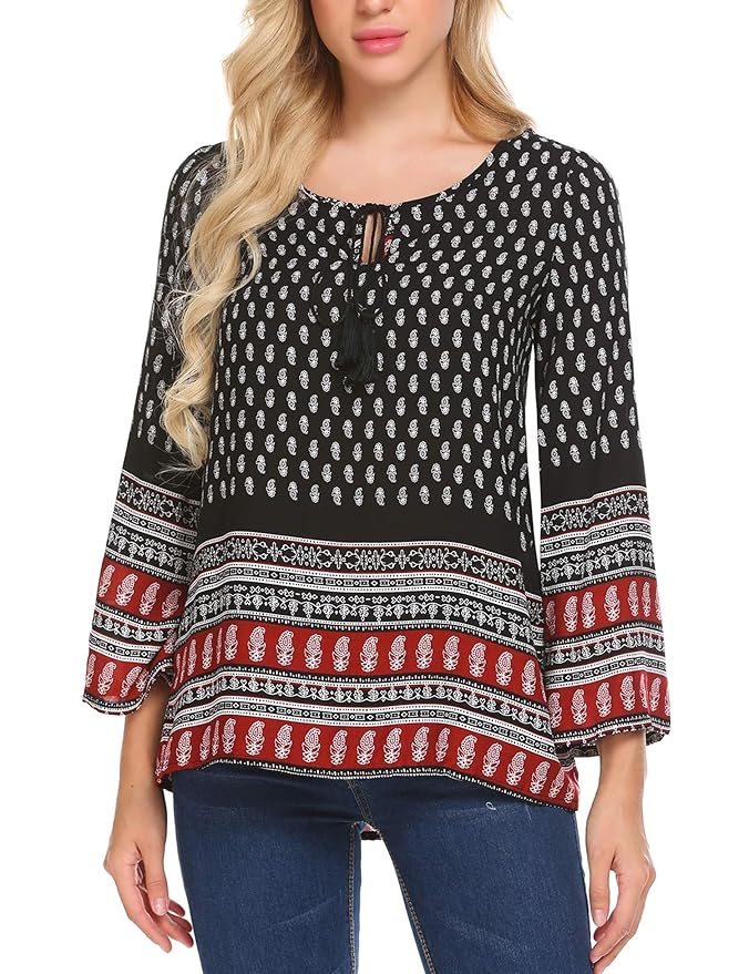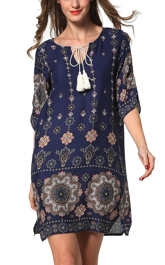 The Bohemian Printed Chiffon Blouse Dress Features: Tassel tie neck, Vintage ethnic style tribal printed, Long flare sleeves, lightweight and loose fitting summer shift dress, Unique tassel trim design. You can't miss it!