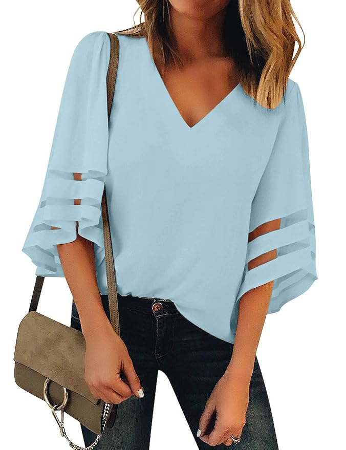 $19.99 Vetinee Women's 3/4 Bell Sleeve Shirt Mesh Panel Blouse V Neck Casual Loose Tops