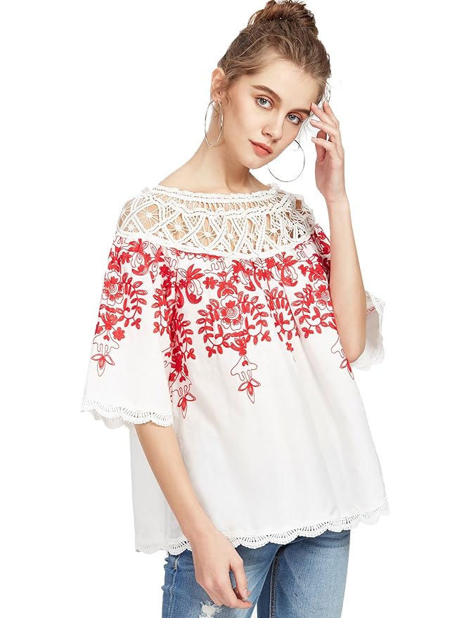 $24.69 Romwe Women's Cold Shoulder Floral Embroidered Lace Scalloped Hem Blouse Top