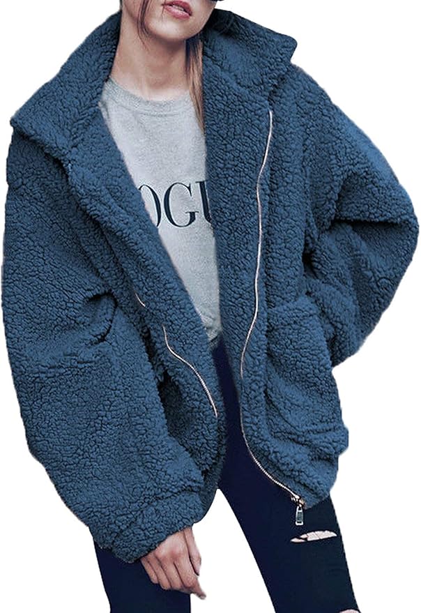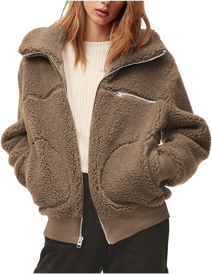 SHIBEVER Fluffy Women Coats Faux Wool Blend Warm Winter Jacket Zip Up Long Sleeve Oversized Fashion Outerwear