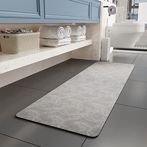 No Watermark & Dirt Resistant: This innovative bathroom floor mat solved the hard clean problem of other diatomite stone bath mat or fluffy bath mat. Innovative PU leather surface can absorb dripping water instantly without leaving any marks or stains. Bath rugs for bathroom set you free from frequent clean.Super Absorbent & Quick Dry: Ultra porous super absorbent bath mat can suck up water into diatomaceous earth layer quickly, then fully evaporate within few minutes, as if it has never got wet. This quick dry bath mat won’t be too wet for the next user.Non Slip Bath Mat:100% premium rubber backing has stronger grip on wet tile floor. Moreover, waterproof rubber backing can prevent water leaking underneath and mess up the floor. Perfect rubber bath mat to minimize the risk of slipping and falling.Durable & Easy Clean: Smooth surface serve for long term use without fiber shedding, wearing, tearing or fading trouble. No need for complicated washing and care. Simply brush or rinse the washable bathroom rug, and then hang it for air dry.Wide Use & Cut to Fit: It's more than a bath mat. It also can be the drying mat for toilet, sink, kitchen, laundry room, entryway, swimming pool and any other places easy to got wet. It can cut to fit some personalized bathroom design. Thin bathroom rugs fit under door and friendly for wheels.